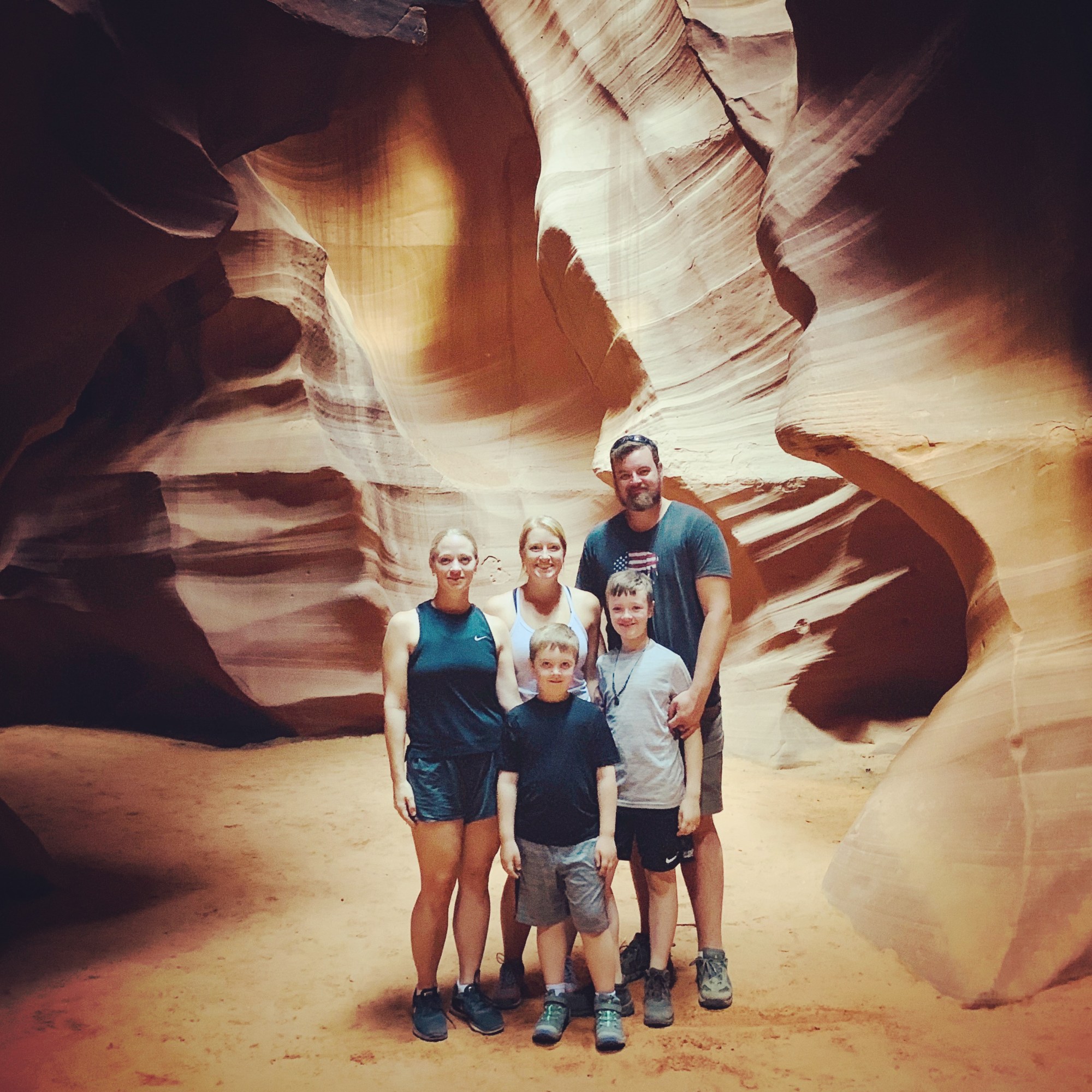 Quickly becoming one of the most popular slot canyons in the world, Antelope Canyon is a stunning site to tour. Water has gradually eroded the sandstone to leave behind curves in the rocks. Throughout the day, variations in the lighting creates a beautiful range of colors. The most expensive photograph every to be sold was taken in Antelope Canyon! The most popular tour times for Upper Antelope Canyon are between 11am and 1pm. This is because the canyon is so narrow and the walls are so high that when the sun is directly overhead distinct beams of light shine down, creating some amazing sights and opportunities for photographs. We booked our tour a full nine months prior to visiting, and even then, the midday times were completely sold out. So we opted for the first tour of the morning (7:00am) with Antelope Canyon Tours to avoid the crowds. It started with a dusty, open-air ride through Page and then onto some dirt roads leading to the entrance of the canyon. The tour itself was only about an hour of easy walking. We had a great guide named Malcolm who told us about the history and geology of Antelope Canyon and showed us how to get some really interesting photos. I was worried about not seeing the canyon at midday, but it was gorgeous and peaceful.
