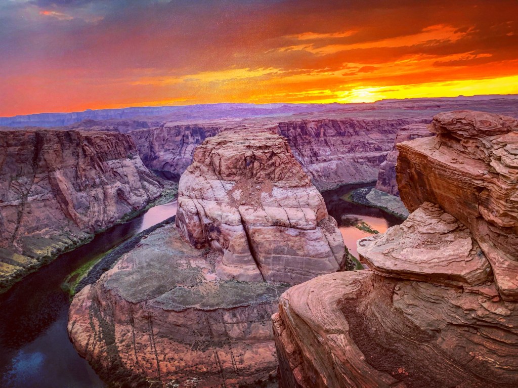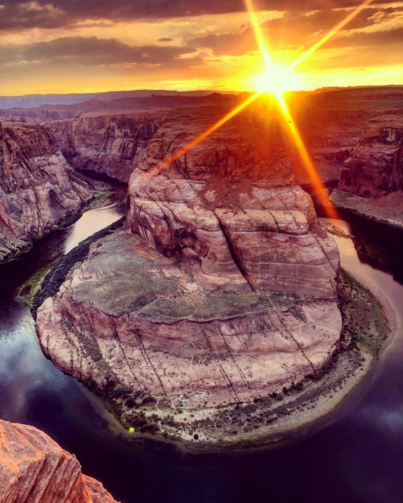 Horseshoe Bend is a scenic vista just south of Page. From the overlook, visitors can see the spot where the river curves, creating the shape of a horseshoe. There is a half mile trail leading to the views of the river, and all around the overlook are big rocks to sit on or climb for different view points. I imagine that it’s beautiful here no matter what time of day, but we opted to visit at sunset, and it was an incredible view!