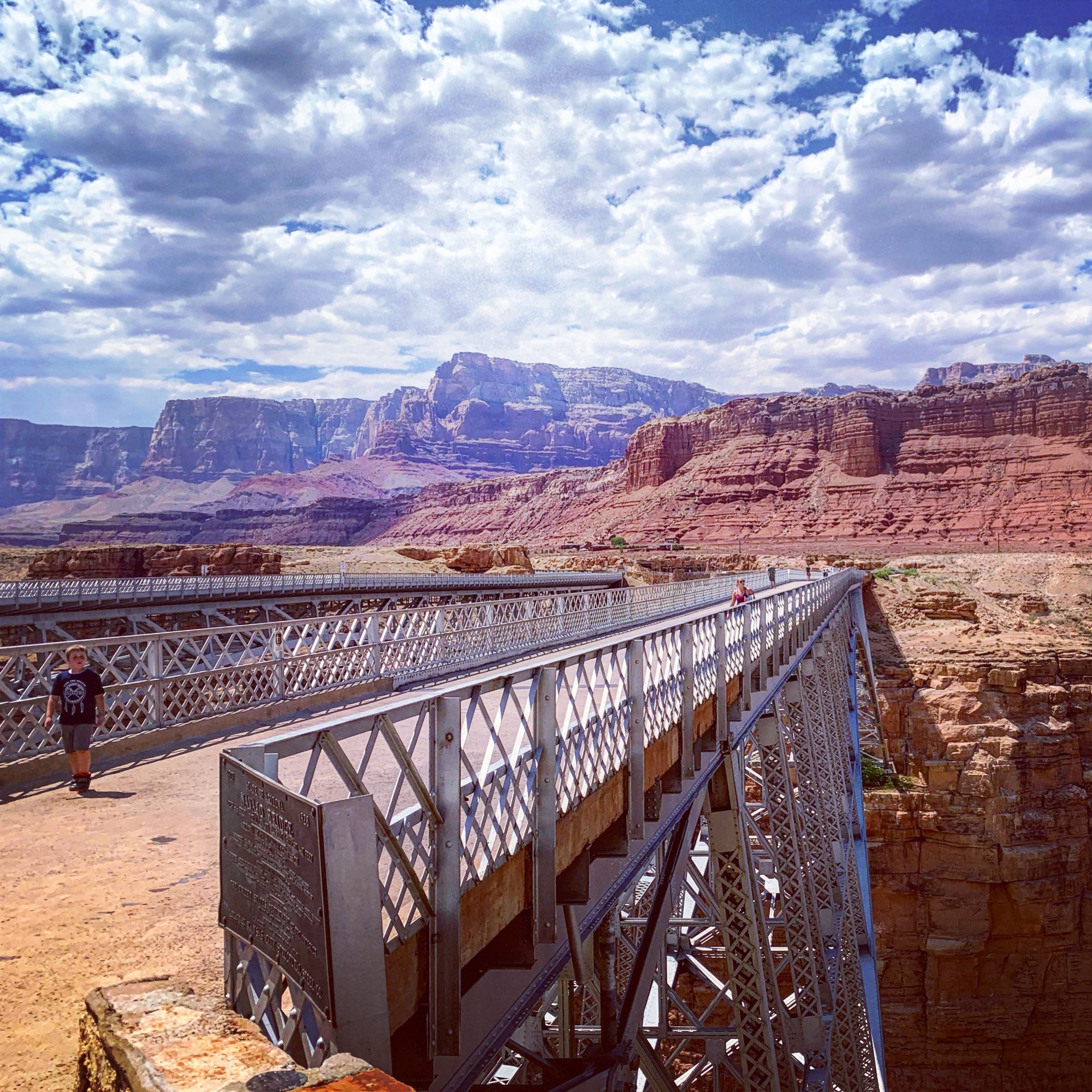 I’m usually a much bigger fan of the destination than I am of the journey, but we decided to take the slightly longer route from Zion National Park to Page, Arizona, driving the scenic Route 89A. We made several stops, first at the overlook of the Vermillion Cliffs as we traveled down past Jacob Lake, where we ate a picnic lunch using the big rocks as tables. Then we pulled in to Cliff Dwellers, which has an ancient rock house that is free to go inside. After seeing the amazingly well-preserved ruins at Mesa Verde it was a little underwhelming, but there were also Navajo women there selling handmade jewelry and other items. We made a quick stop at Marble Canyon, checking out the trading post (which had some interesting items), and then continuing on to Navajo Bridge. When it was constructed in 1929, the original Navajo Bridge was the highest bridge in America, allowing travelers to cross the Colorado River. Now there are two bridges at the site, the original one that is only open to foot traffic, and the newer one for vehicles to cross, along with a small Visitor Center. All along the way, the colors of the rocks that make up the Vermillion Cliffs were amazing. It was a great drive that the whole family enjoyed!